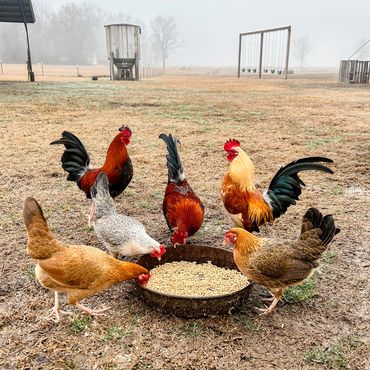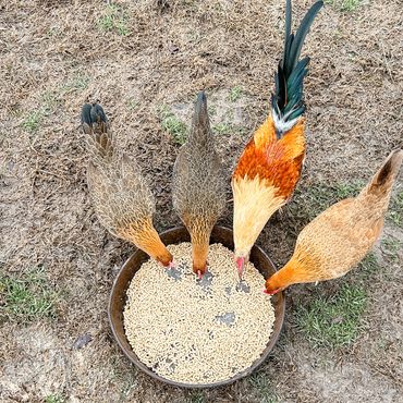 Chickens love to eat! Keep their waterers and feeders full at all times.