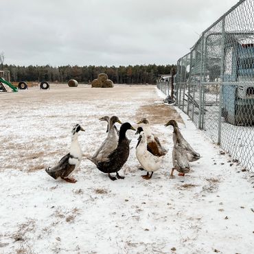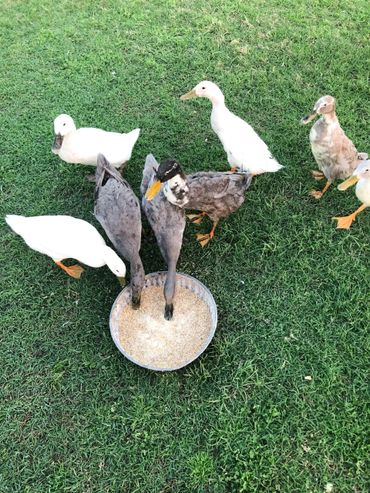Ducks are great foragers. They love to eat grass, bugs and slugs. However, it is still important their diet consist of a quality duck feed to provide them with the protein and vitamins they need to grow. They also love floating food too! We like to throw in dried mealworms and frozen peas in their water.